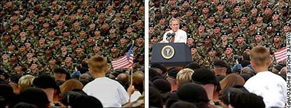 2004: Προς το τέλος της προεκλογικής εκστρατείας για την εκλογή του Αμερικανού Προέδρου, η εκστρατεία του Μπους κυκλοφόρησε ένα τηλεοπτικό σποτ με τον τίτλος «Whatever it takes» (που σημαίνει στα ελληνικά «Ό,τι κι αν χρειαστεί» ή πιο ελεύθερα «Θα κάνουμε τα πάντα» ή «Πάση θυσία» - το σλόγκαν έχει διφορούμενη σημασία, όπως το αντιλαμβάνεται κανείς). Το σποτ περιλάμβανε μία φωτό (πάνω) πλήθους στρατιωτών να ακούν την ομιλία του Μπους, και ένα πιτσιρικά στο πρώτο πλάνο να κυματίζει μία αμερικανική σημαία.